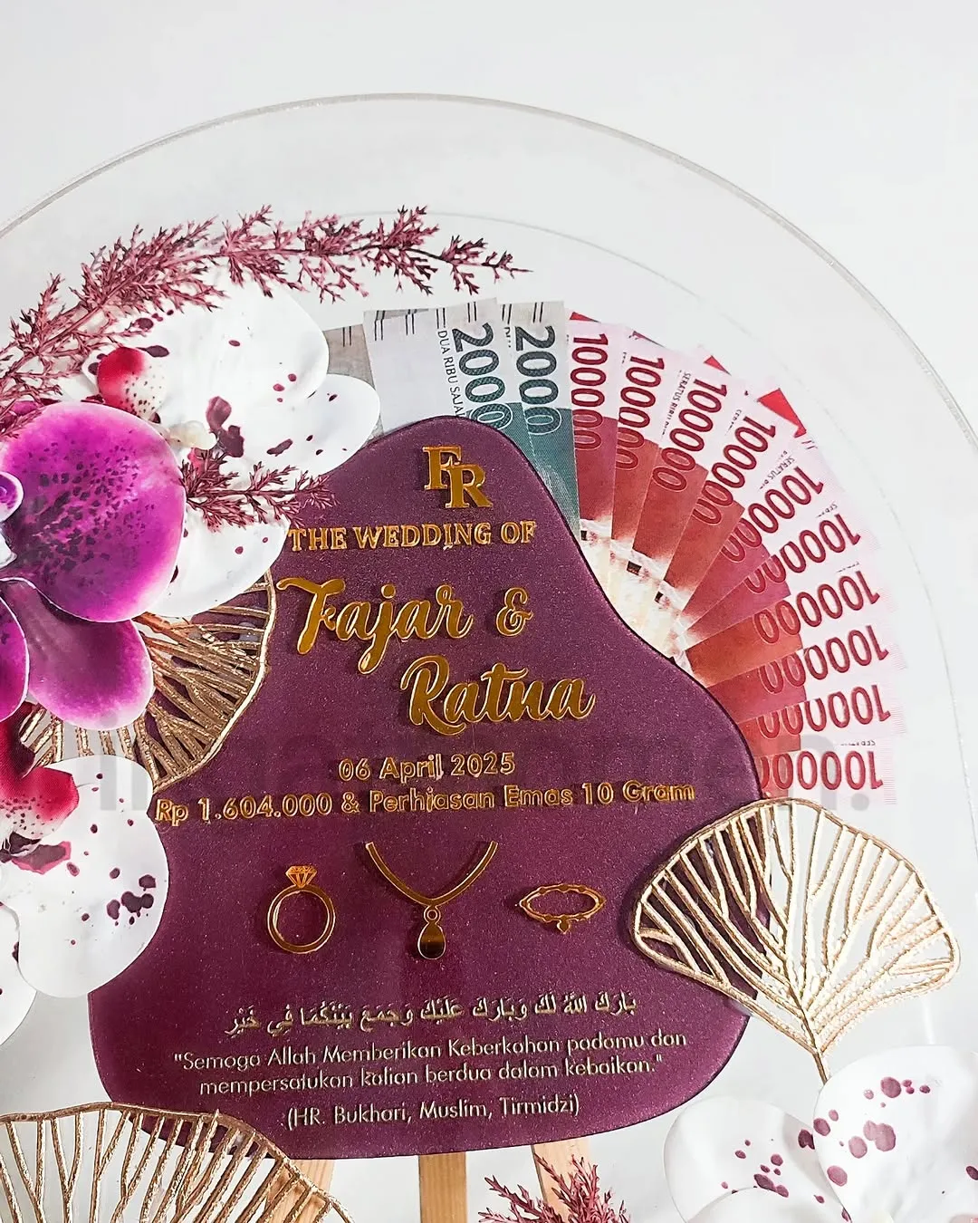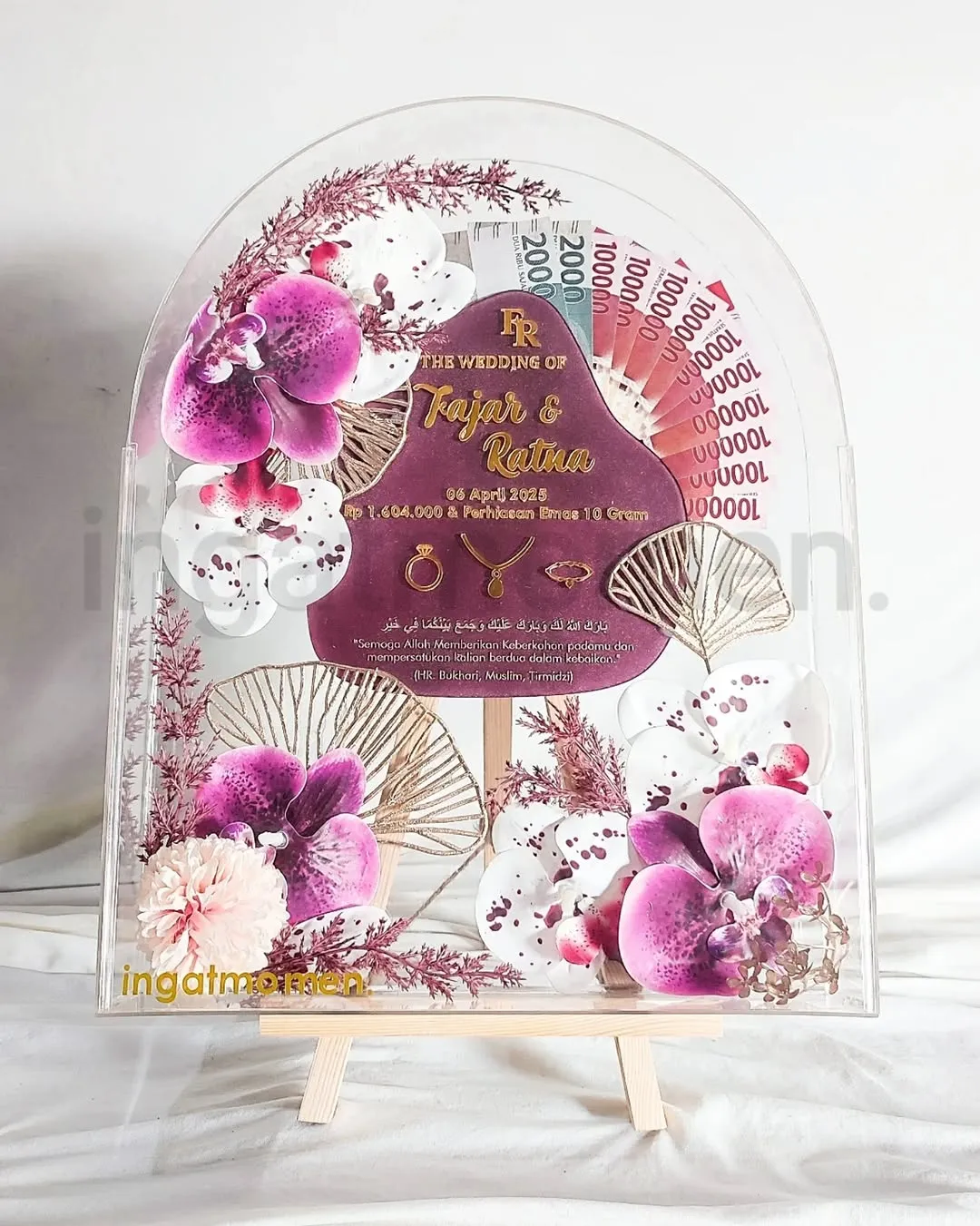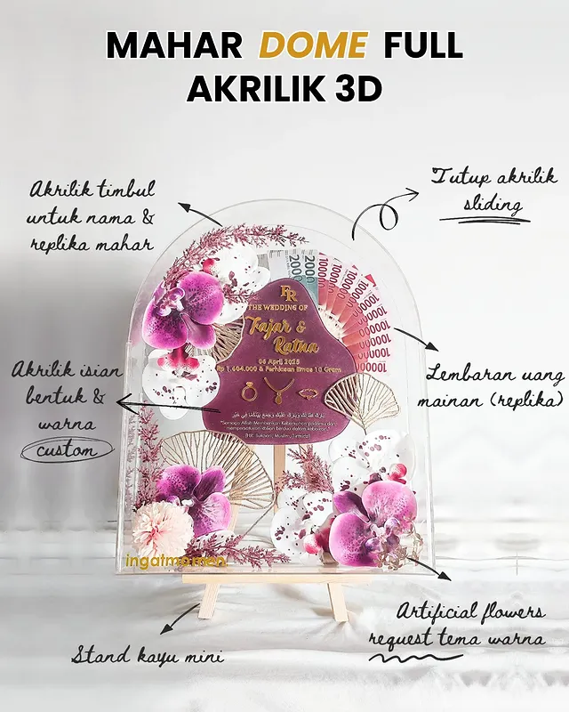 Mahar Dome Full Akrilik 3D dengan model elegan dan tampilan exclusive dilengkapi Akrilik Isian dengan bentuk dan warna sesuai request, Desain Isi Tulisan Custom, juga Bunga Dried Flowers / Artificial yang cocok untuk mengabadikan momen indah pernikahan kalian semua.